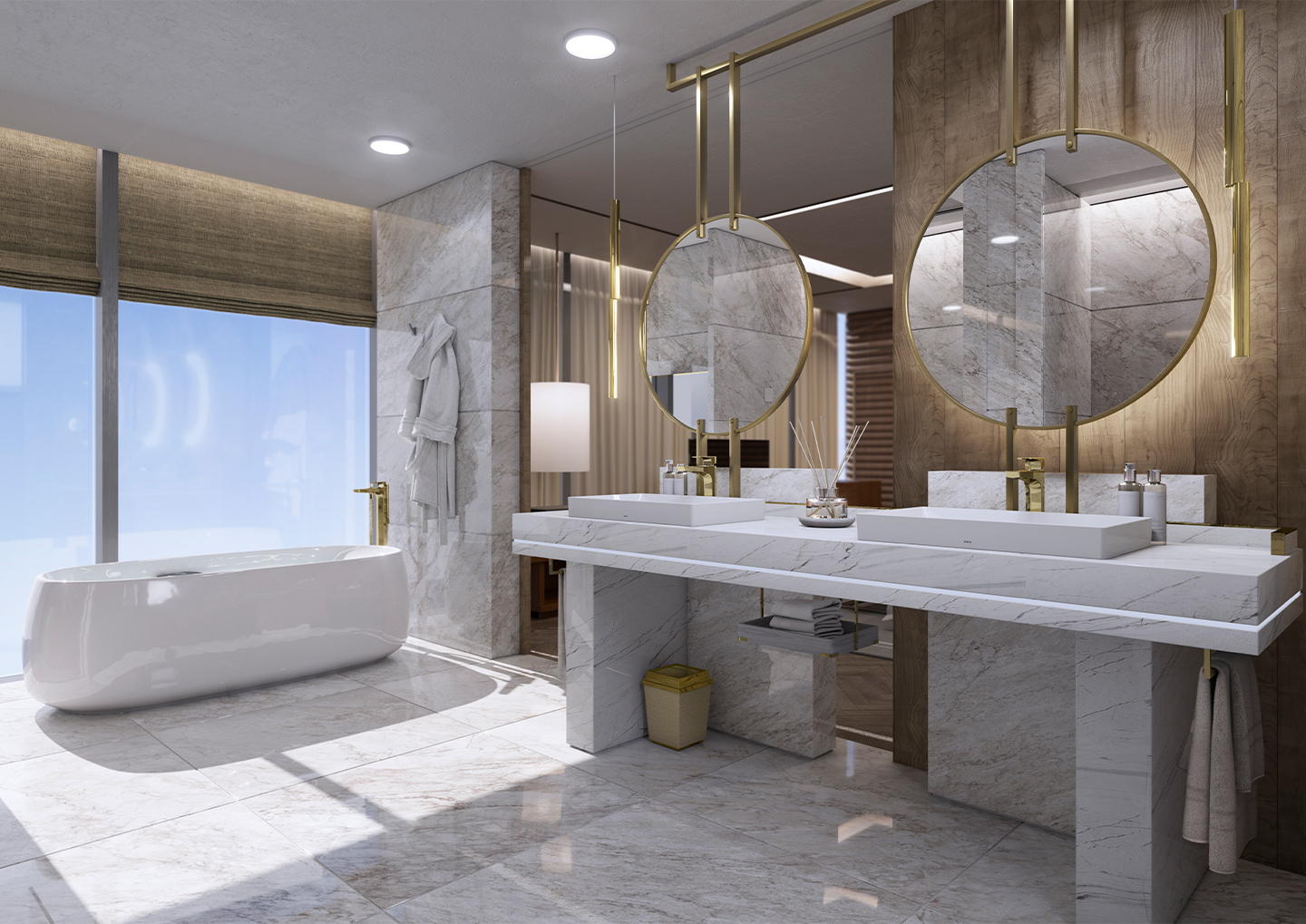 酒店衛(wèi)浴空間采用了白色大理石墻壁和地板,簡(jiǎn)潔而優(yōu)雅。
